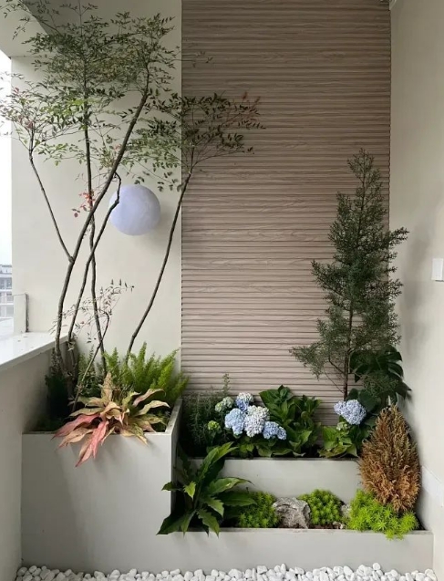其次,巧妙的設(shè)計(jì)可以增加陽臺花園的層次感和美觀度。在陽臺的一側(cè)安裝簡易的花架或吊盆,讓植物在垂直方向上也有生長空間;使用不同高度的花箱或花壇來擺放植物,形成錯(cuò)落有致的視覺效果;甚至可以在陽臺上懸掛一些小巧的裝飾物,增添趣味?。