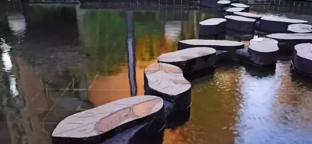 3、水中汀步應(yīng)盡量親近水面,營(yíng)造仿佛于水上的效果,盡量避免汀步基座外露。