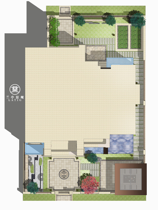 禪意靜謐的枯山水;流水潺潺,輕巧優(yōu)雅的活力因子;北有泰山石,鎮(zhèn)宅護(hù)院,南有招財(cái)水,