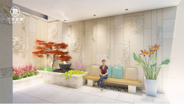 3. L形圍合的墻面,缺少豎向花園景觀,且墻體較高,整個(gè)空間缺乏生命力,在入口對(duì)景處營造一處涌泉水景, 并陪襯一株姿態(tài)優(yōu)美的羽毛楓在旁,共同等待主人歸來;它既能在回家或健身時(shí)讓人觀賞悅目,又能襯托整個(gè)入戶花園空間的靈動(dòng)和精致。