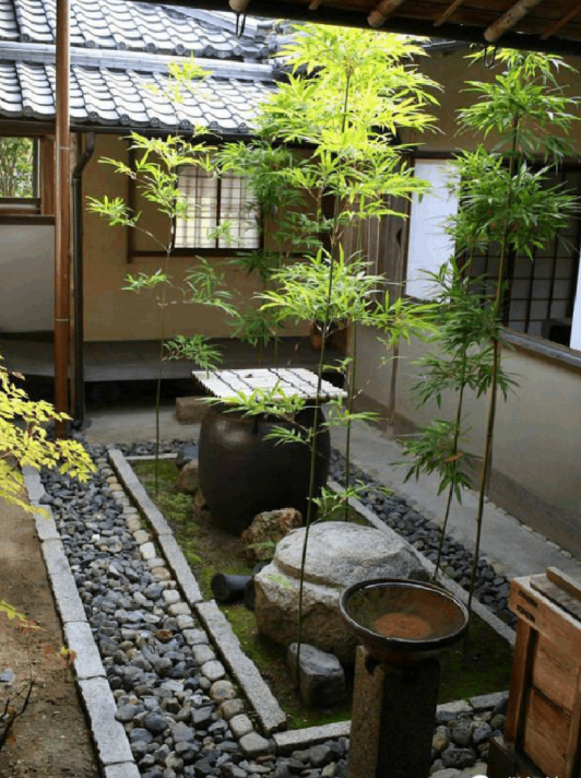 東方式庭院的喬木比較注重形態(tài)和意義。雞爪槭、松柏、竹、都是很好的選擇。槭樹葉子在秋季會變?yōu)榧t色,能給庭院增添很多美感。松柏多植于山石旁,有“言志”、“比德”之意。竹宜叢生,院角、屋后、庭內(nèi)皆宜。竹空心,有君子虛心好學之意;又有節(jié),為高風亮節(jié)。