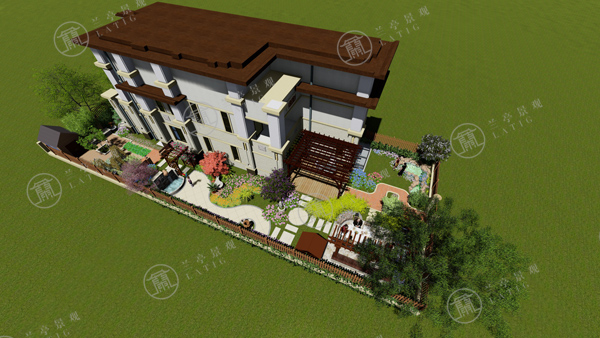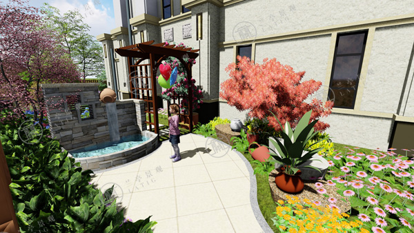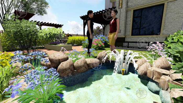 2.東方具有木氣,喜木喜水,宜布置水局。設(shè)計(jì)師在庭院的東南角布置一處自然水景,與花草結(jié)合,富有生氣。