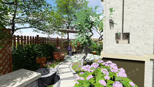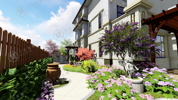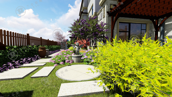1.整個(gè)青島庭院設(shè)計(jì)分為入口水景、廊下休閑、花徑小路、田園菜地和秋千花園幾大部分。進(jìn)門處布置樹池,以解決庭院門與建筑門相沖的問題。