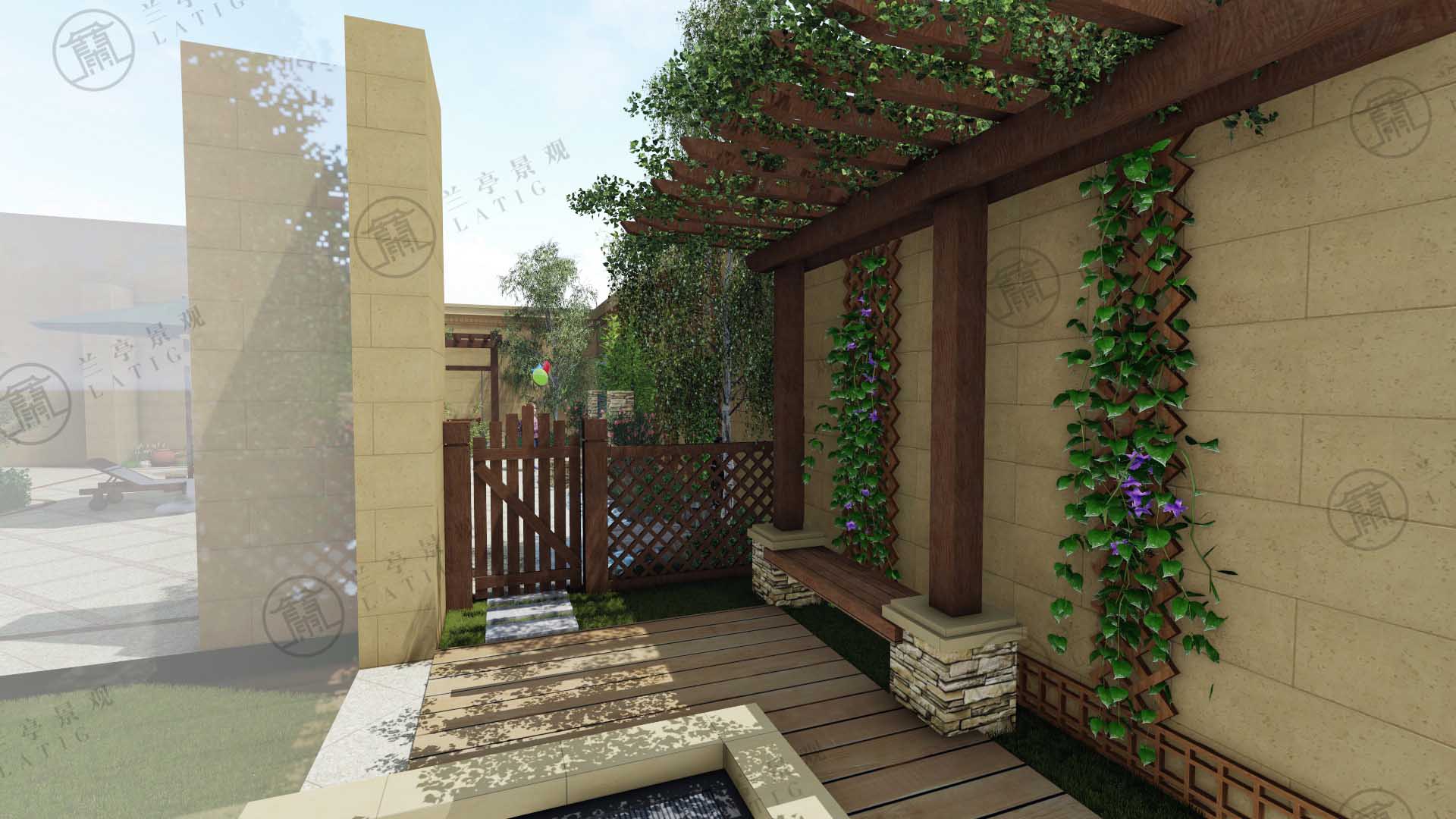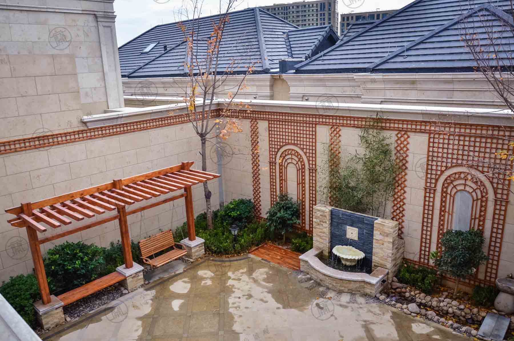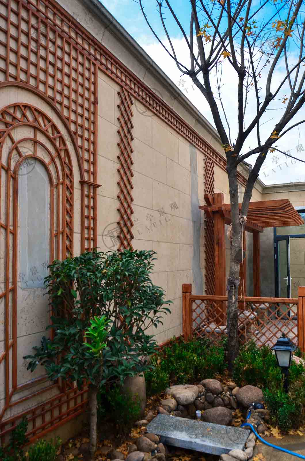墻體飾拱門木格柵,在視覺上增加庭院的空間感。使原本高大死板的圍墻變得生動柔和,大大減弱了對人的壓迫感。