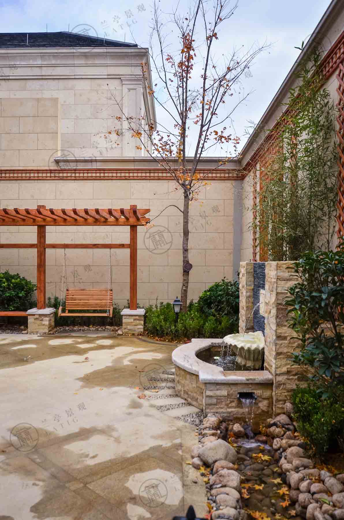 水景墻與模仿自然的小溪連成整體,跌水、流水、靜水依次展現(xiàn)循環(huán)往復(fù),流水代表財源滾滾,也活躍了小院氣氛,增加了活力與生機。