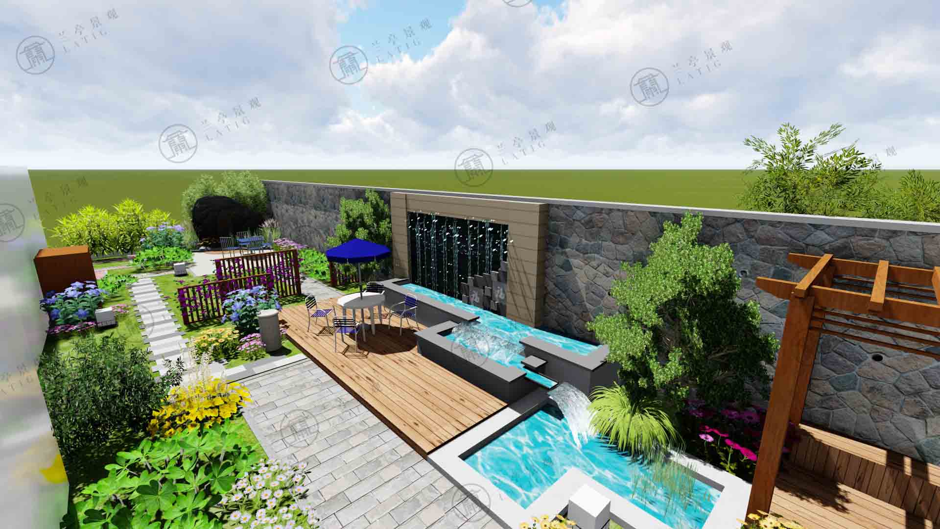 首先,確定庭院的簡(jiǎn)中式風(fēng)格,偏灰調(diào)。根據(jù)庭院中原有的水系建造水幕墻,使水“活起來(lái)”,讓整個(gè)高墻不再單調(diào);留出足夠的種植空間及陽(yáng)光草坪,讓喜愛植物的戶主感受到植物的環(huán)繞;此外,我們也在夜景上下了功夫,柔和的燈光投射到植物上,營(yíng)造出令人舒適的空間。