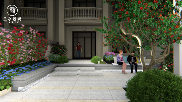 解決方案:出戶對景墻選用一路繁花相送的寓意,為客戶打開花園的門廳。兩側(cè)的微地形景觀疏朗有致,搭配上花盆軟裝,輕奢有質(zhì)感。