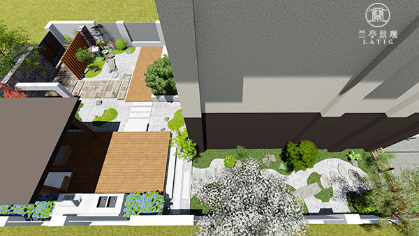 南院和側院風格定位為現(xiàn)代日式風,北院風格定位為田園風。通過設計讓原本不大的兩個花園空間,得到共享。將南、北院兩種不同風格的,完美地融合在一起。