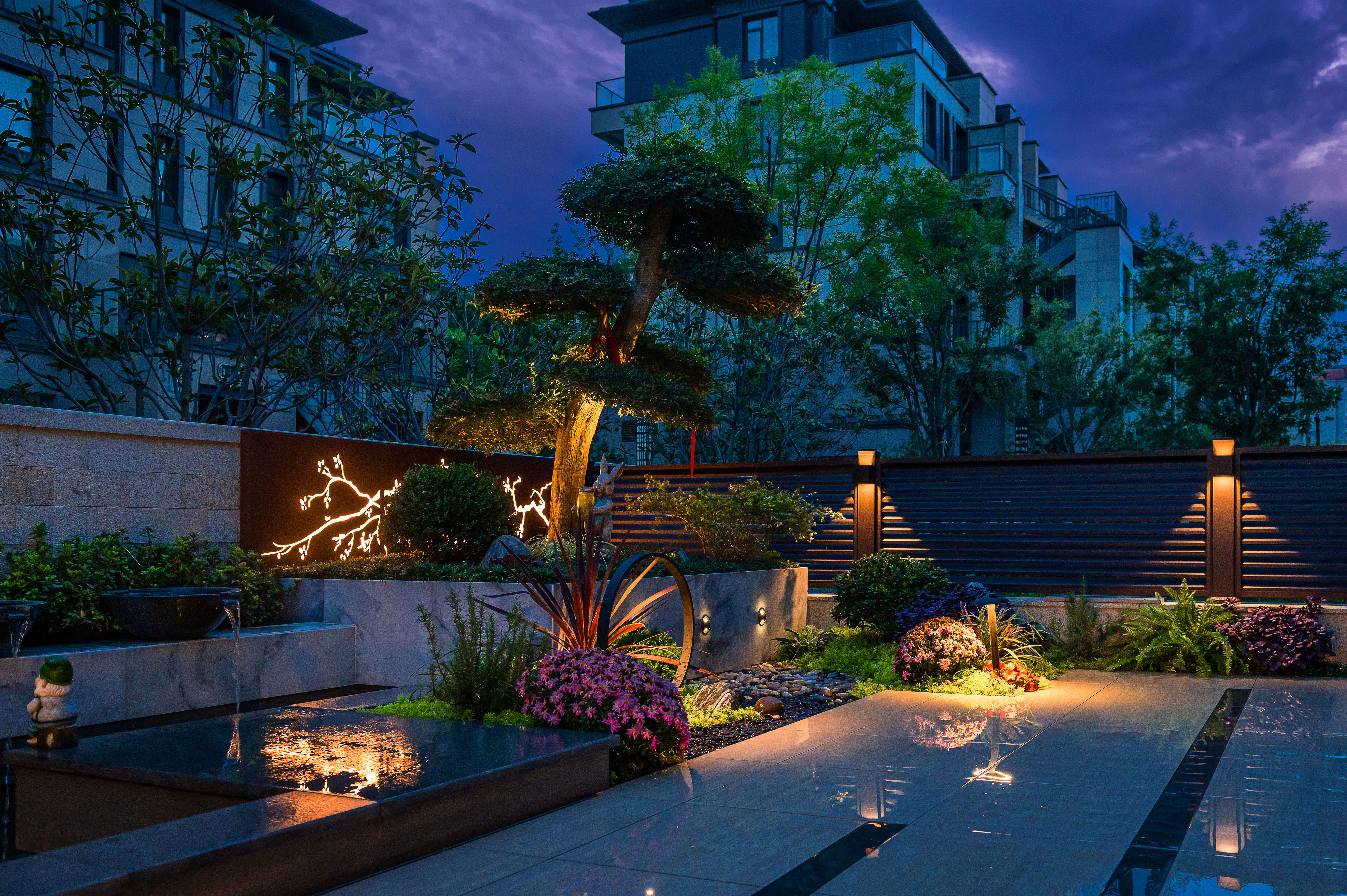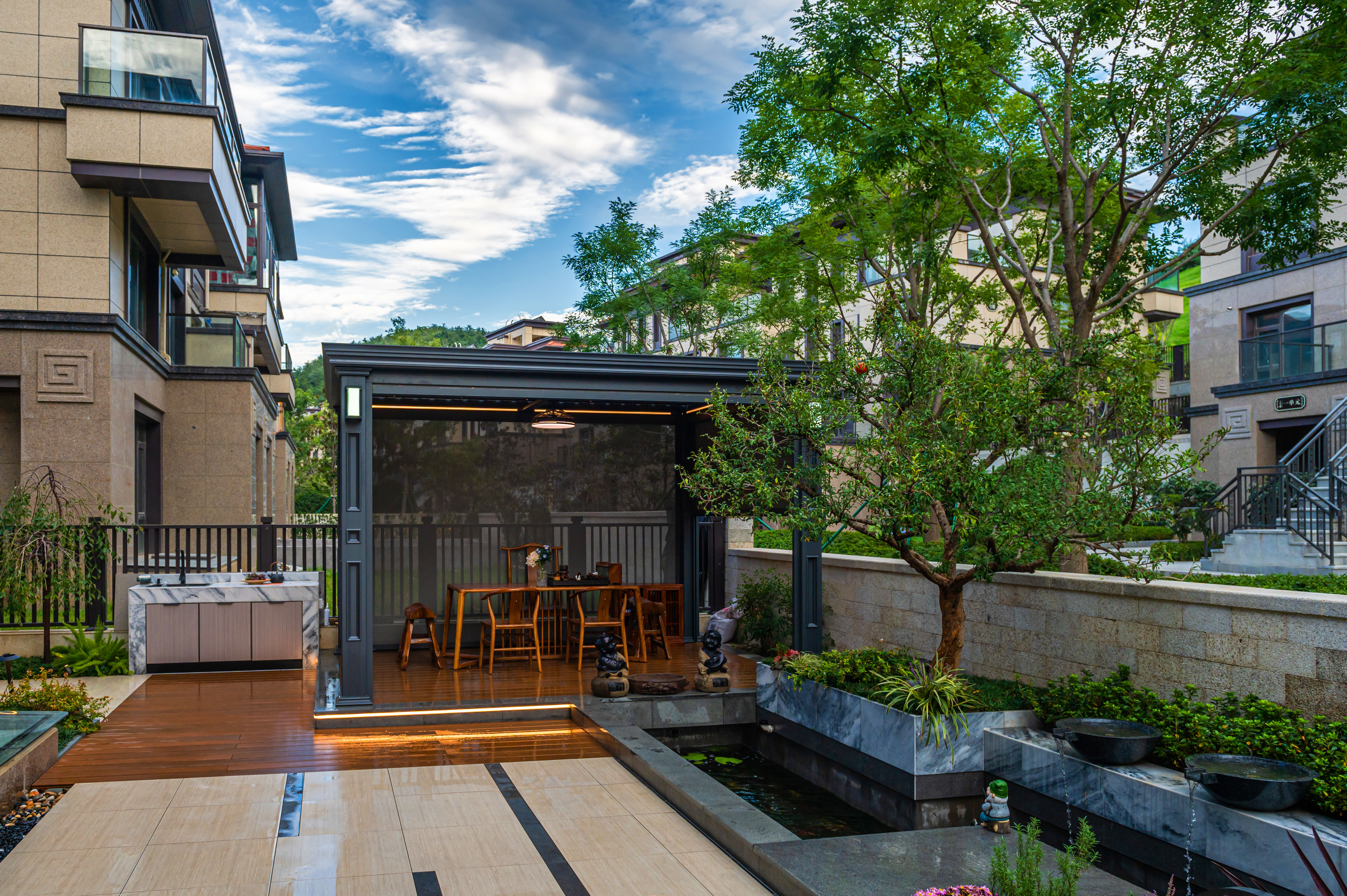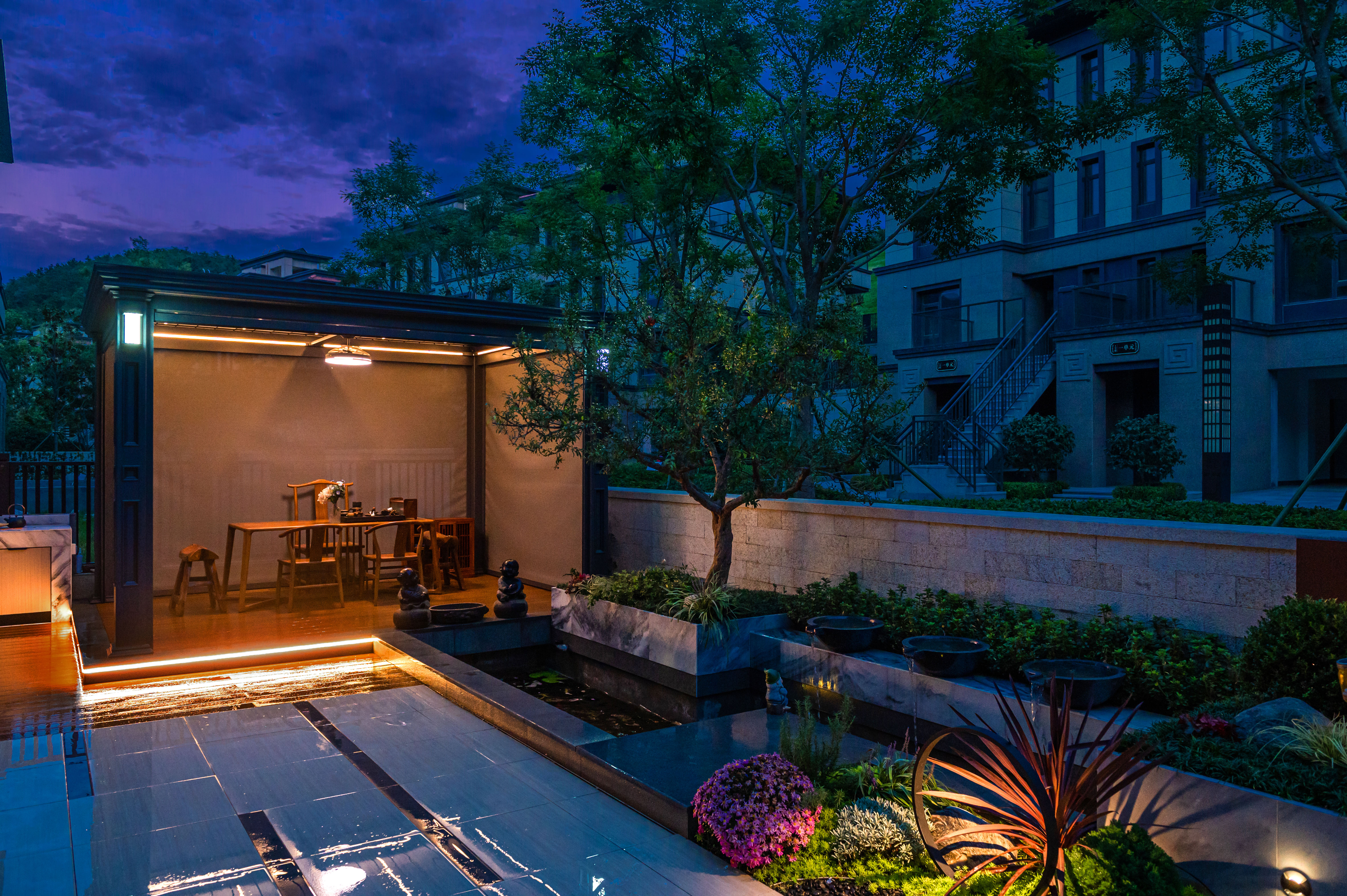 “清風(fēng)明月本無(wú)價(jià),近水遠(yuǎn)山具有情”,該庭院亦是以水景為中心,為空間營(yíng)造更多的活力及趣味。處理空間方面強(qiáng)調(diào)整體空間的寬敞、通透,盡可能不用裝飾和取消多余的東西,沒有實(shí)用價(jià)值的構(gòu)筑物及裝飾都會(huì)增加局促感,對(duì)于小而精的庭院,相對(duì)于強(qiáng)調(diào)形式應(yīng)該更多的服務(wù)于功能。豎向設(shè)計(jì)上,會(huì)客區(qū)的智能化涼亭在加上高低錯(cuò)落的樹池、流水石砵、起伏的綠植地形,營(yíng)造出清新雅致且層次豐富的空間體驗(yàn)感。