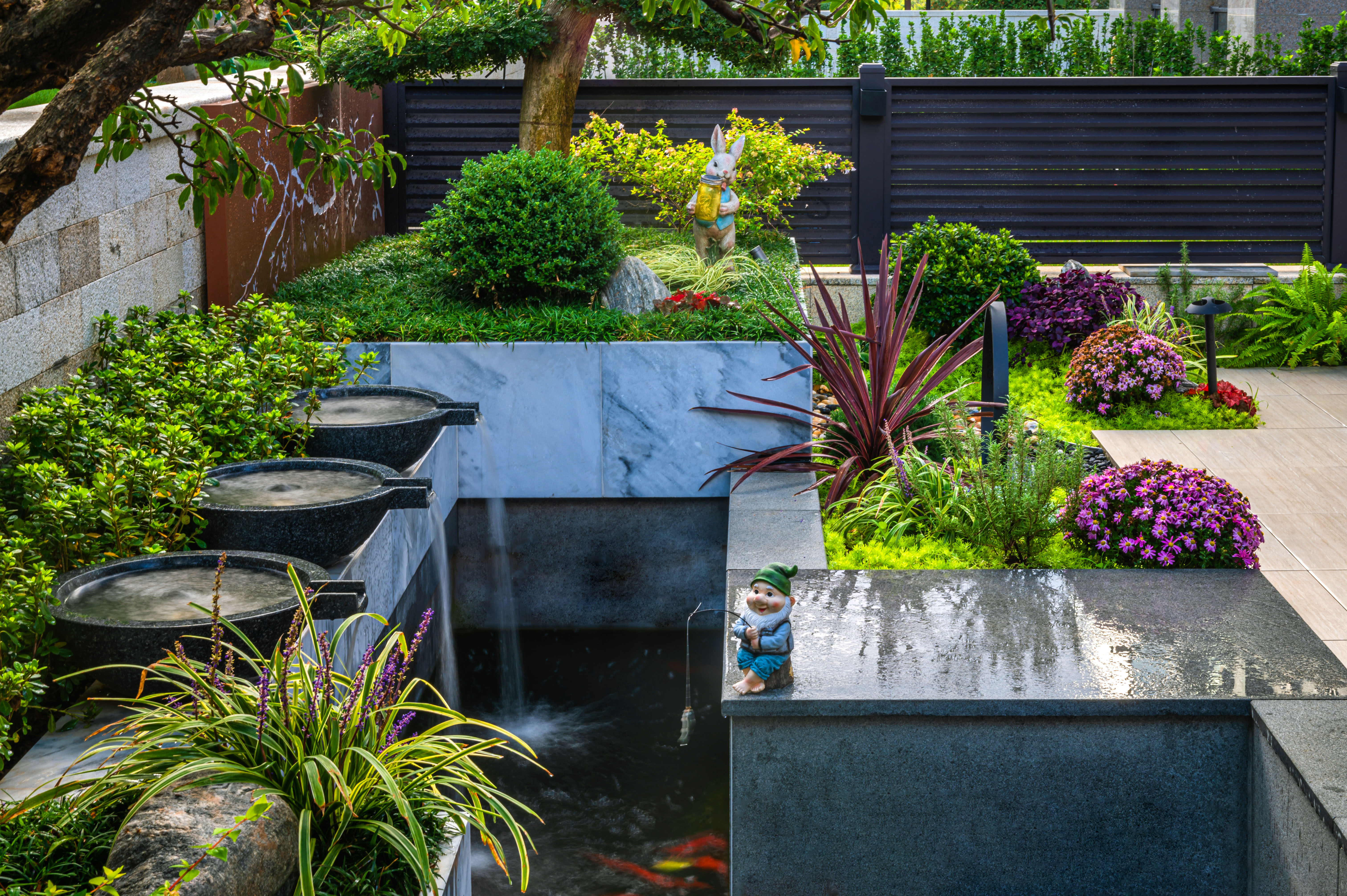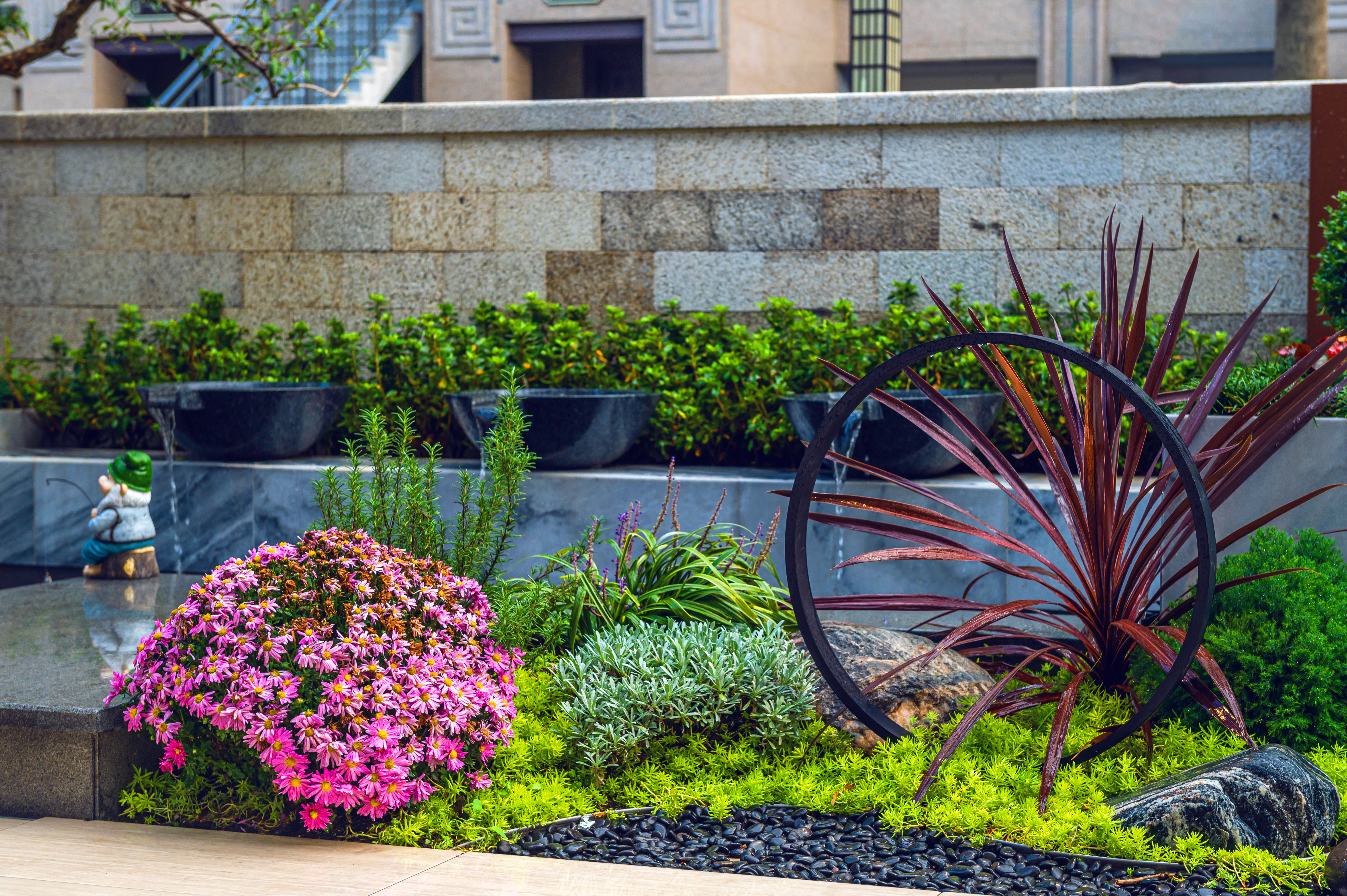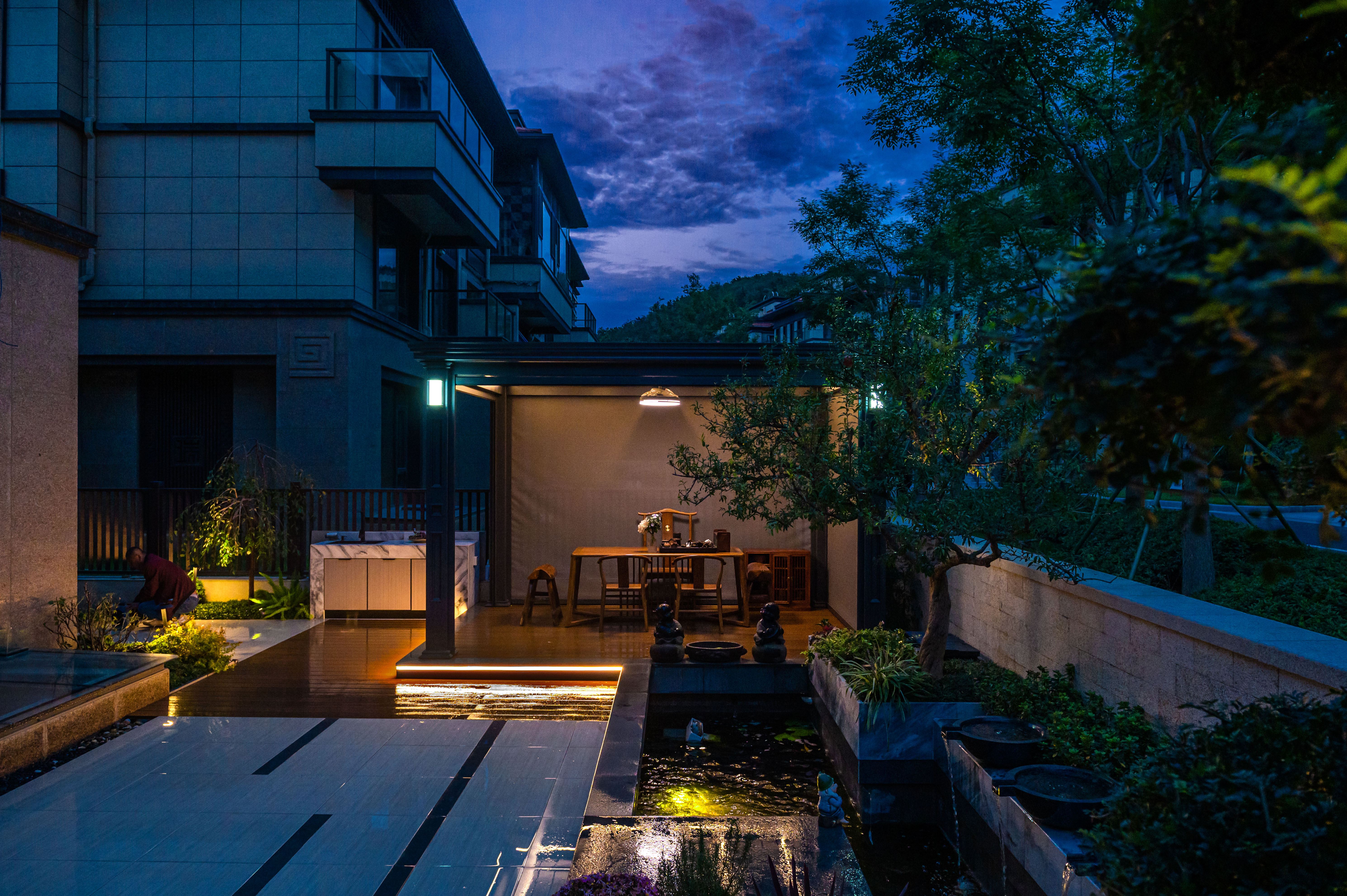 “清風(fēng)明月本無(wú)價(jià),近水遠(yuǎn)山具有情”,該庭院亦是以水景為中心,為空間營(yíng)造更多的活力及趣味。處理空間方面強(qiáng)調(diào)整體空間的寬敞、通透,盡可能不用裝飾和取消多余的東西,沒有實(shí)用價(jià)值的構(gòu)筑物及裝飾都會(huì)增加局促感,對(duì)于小而精的庭院,相對(duì)于強(qiáng)調(diào)形式應(yīng)該更多的服務(wù)于功能。豎向設(shè)計(jì)上,會(huì)客區(qū)的智能化涼亭在加上高低錯(cuò)落的樹池、流水石砵、起伏的綠植地形,營(yíng)造出清新雅致且層次豐富的空間體驗(yàn)感。