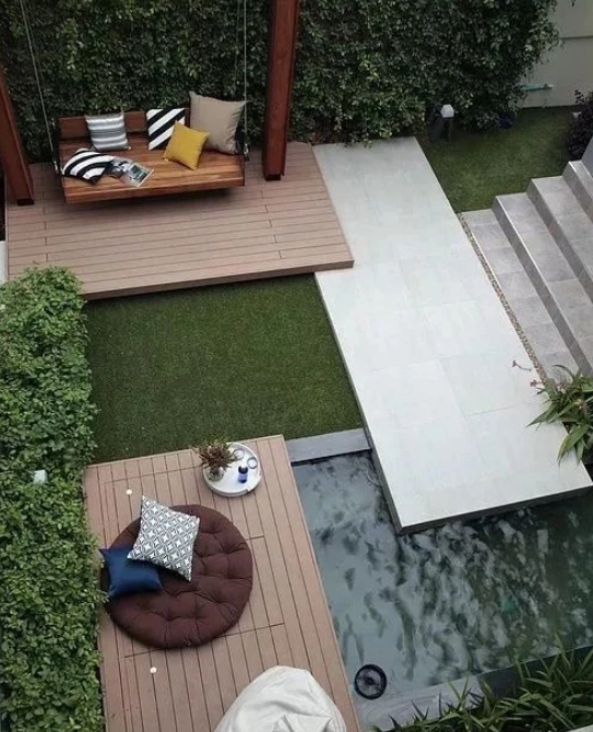 如果你的后院的形狀是方方正正的規(guī)則圖形,可以嘗試一下將布置安排旋轉(zhuǎn)一定角度,不與庭院原有邊界線平行或垂直,這樣可以“創(chuàng)造出”更大使用空間~