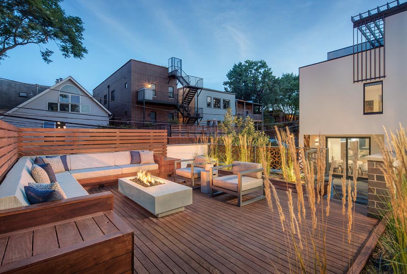 這是一個兩層的屋頂天臺花園,一層二層都是屋頂,一層設(shè)計了一個就餐區(qū)域一個沙發(fā)休息區(qū)域,二樓設(shè)計了一個篝火休息區(qū)域。