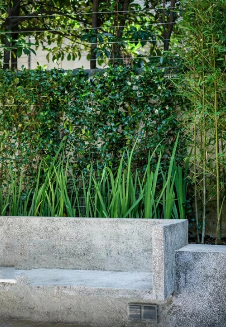 株型與葉形方面,多用天生具有線條感的植物(如鳶尾、紫嬌花、苔草、棕竹等)來呼應庭院清秀而硬朗的格局。避免選用容易下垂的蔓性植物(如花葉絡石、花葉蔓長春等),防止其破環(huán)連續(xù)統(tǒng)一的花壇邊界。