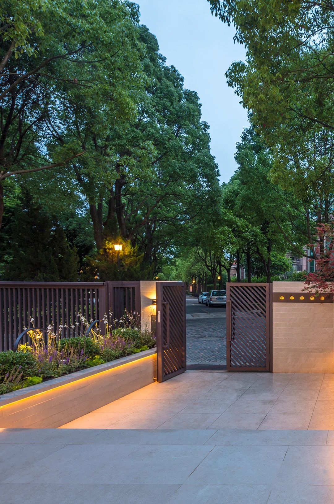 入口的位置在整個(gè)花園里算是下沉空間,也是單獨(dú)的一個(gè)區(qū)域,入戶門和墻面的裝飾燈都是設(shè)計(jì)師特別設(shè)計(jì)的,采用鋁合金烤漆材質(zhì),經(jīng)久耐用。入口的右手邊是一排薰衣草花鏡,電箱的位置也相對隱藏了起來。