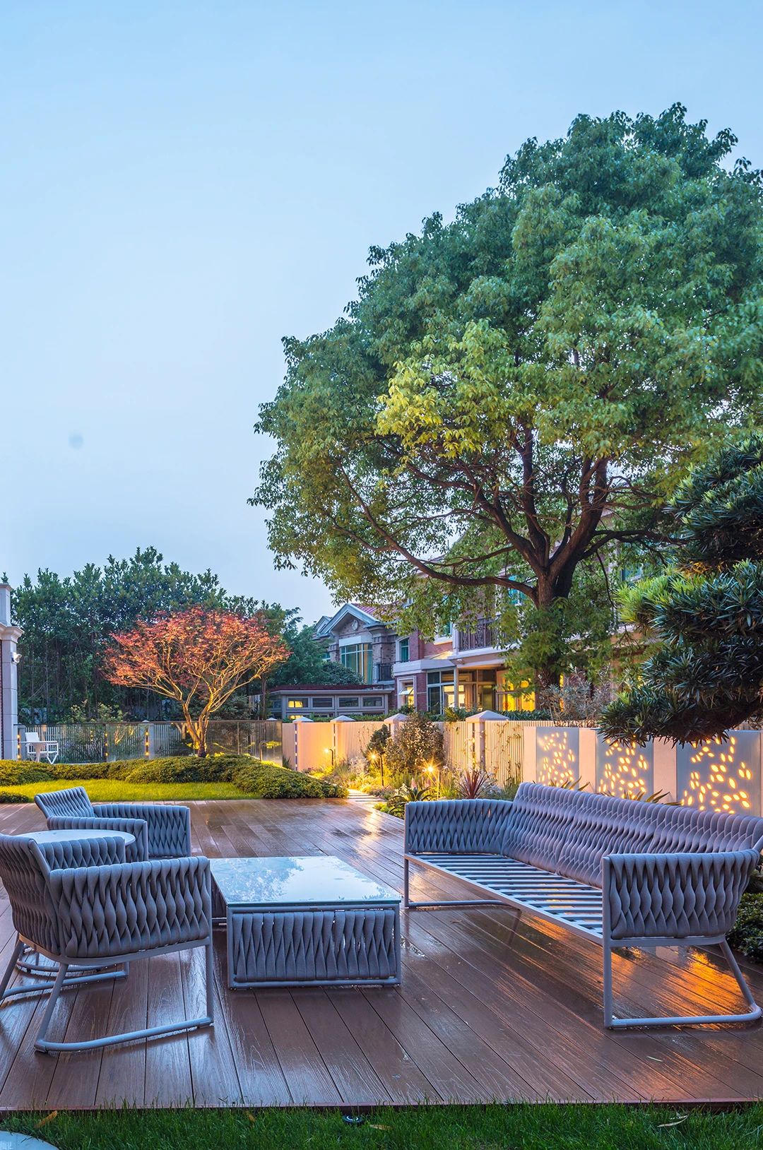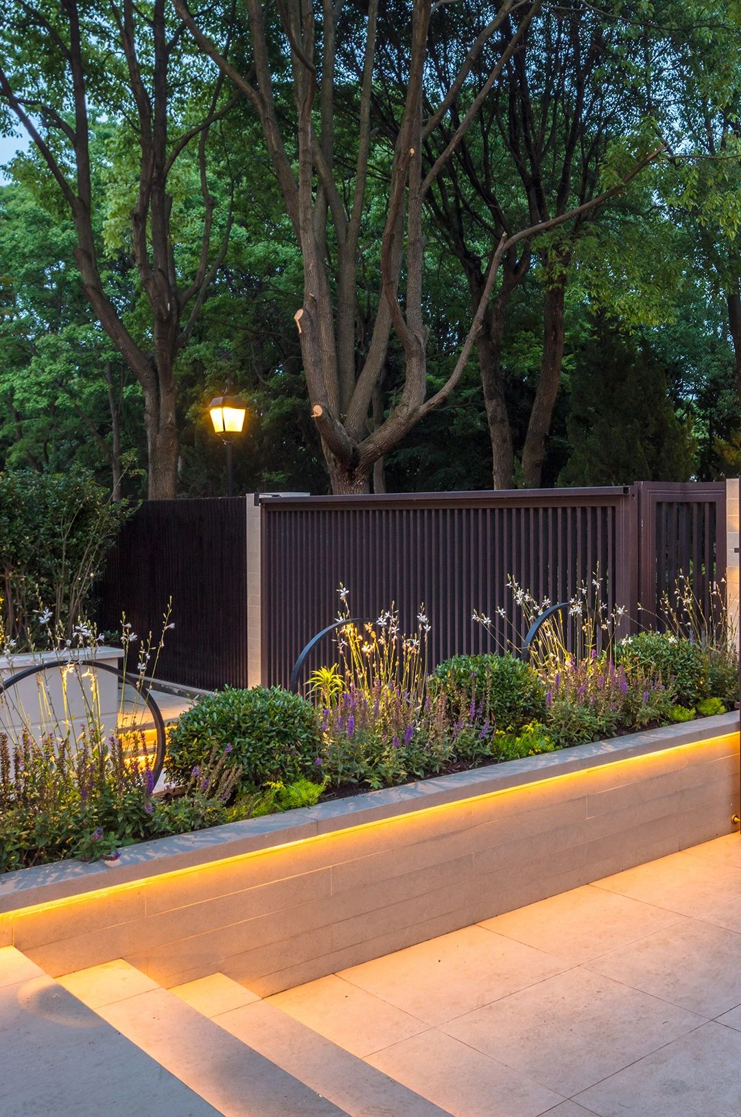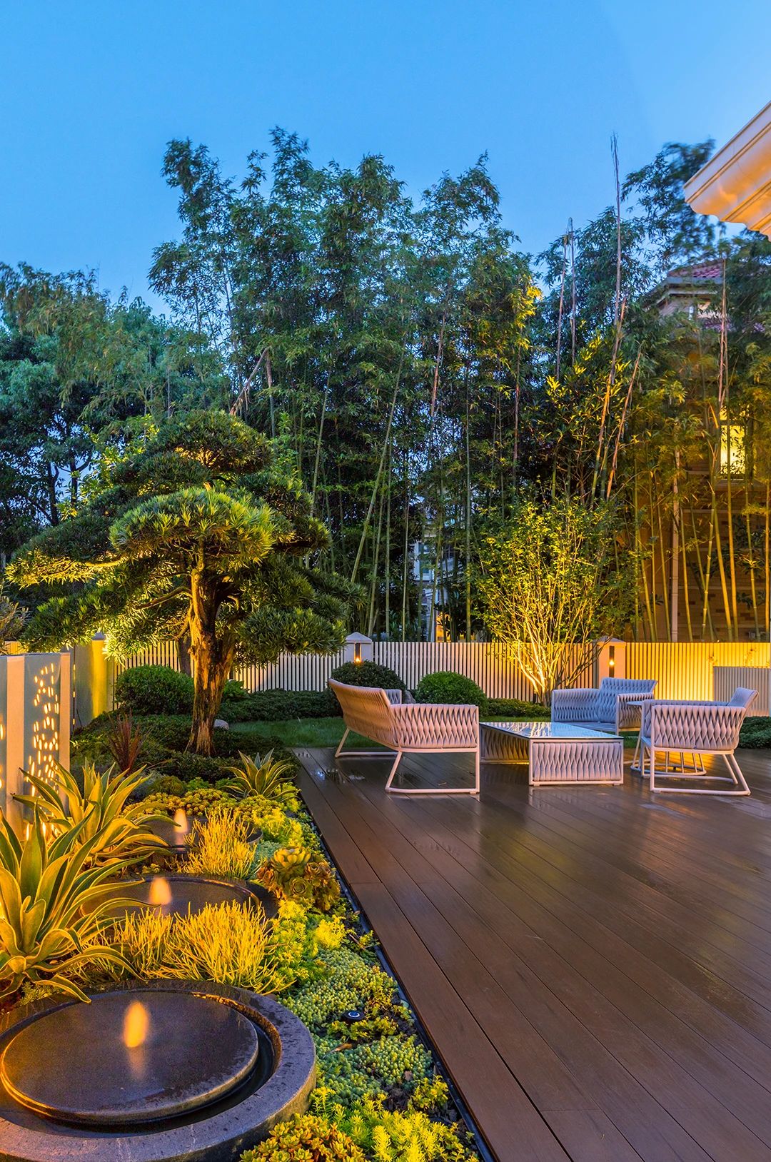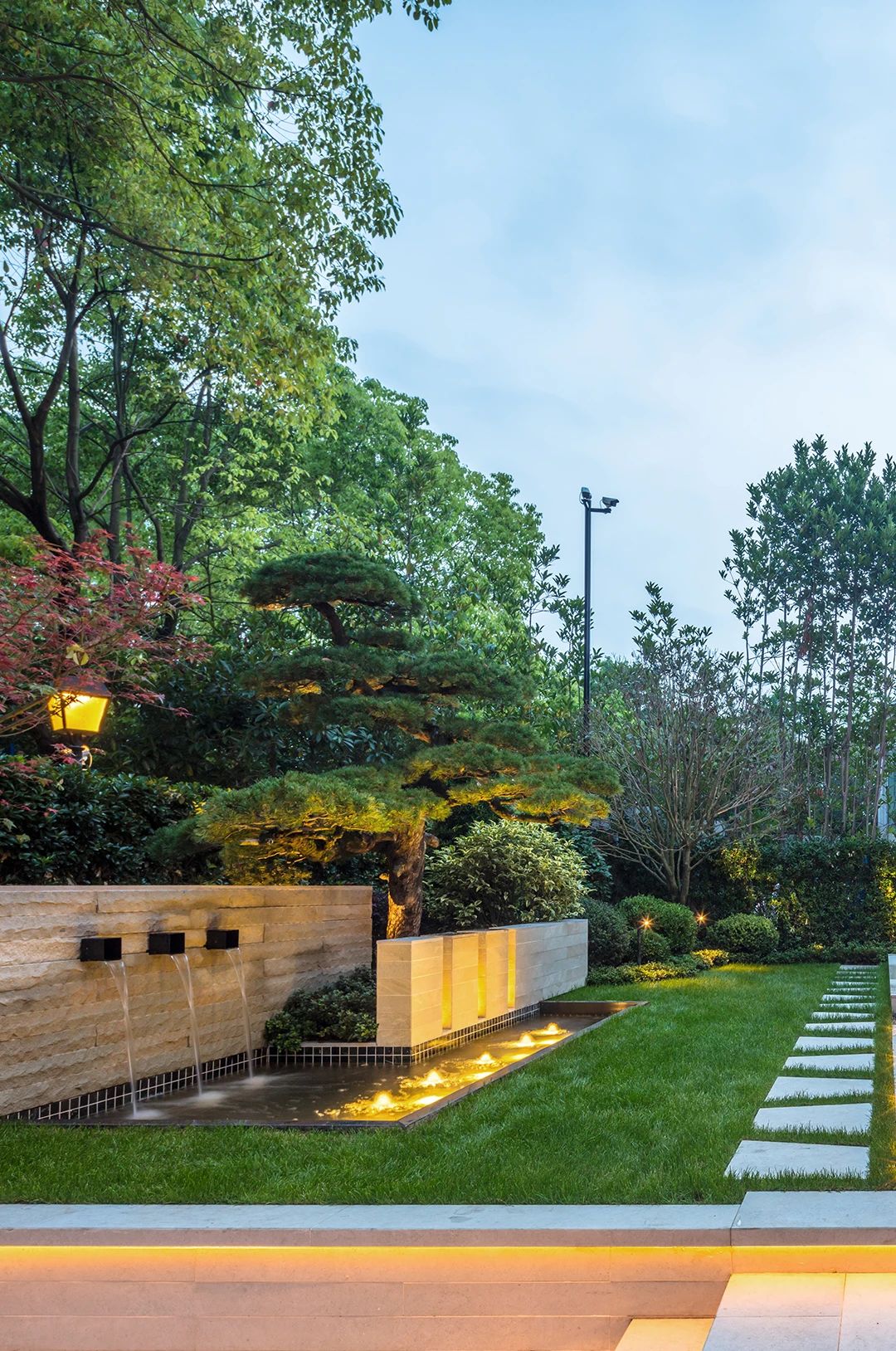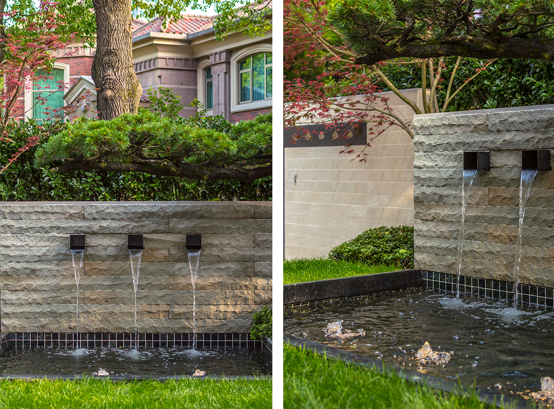 整個(gè)花園的亮點(diǎn)很多,但是這塊背景墻晚上的燈光真的是很吸引眼球,前面的小水景給這個(gè)區(qū)域增加了趣味性。