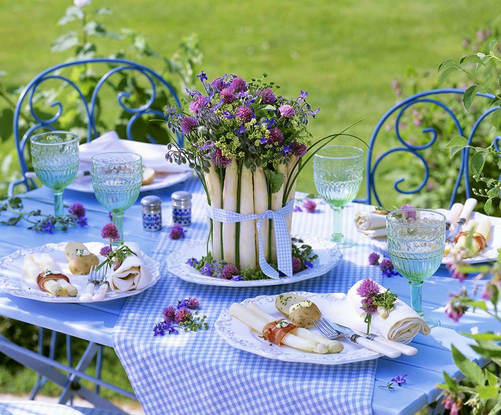 在綠色的草坪上,藍(lán)色的桌布顯得清爽。桌布、玻璃杯、蝴蝶結(jié)等都是同色系,給人統(tǒng)一的清爽感。桌子中央放著白蘆筍和用從院子里摘來的花草做成的花束,整體是清新初夏風(fēng)格。