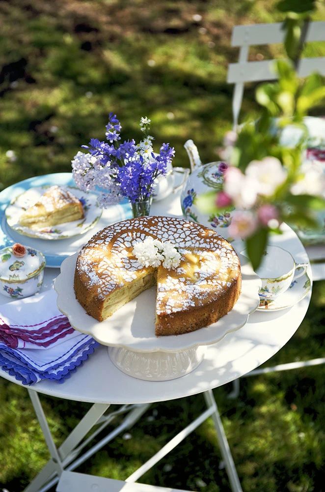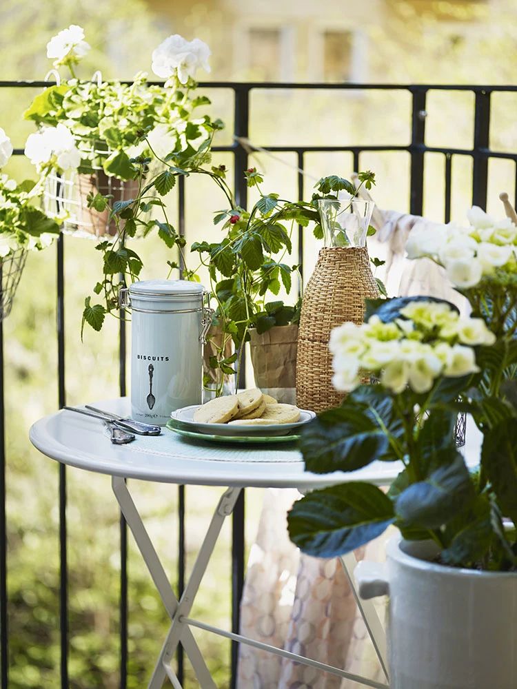 白色的長椅,白色的桌子,白色的椅子,藍(lán)色的靠墊。地中海的度假風(fēng)。陽臺的柵欄上植物垂吊下來,腳邊有紫色的鮮花。桌上放著甜點和飲料,可以悠閑地度過花園時光