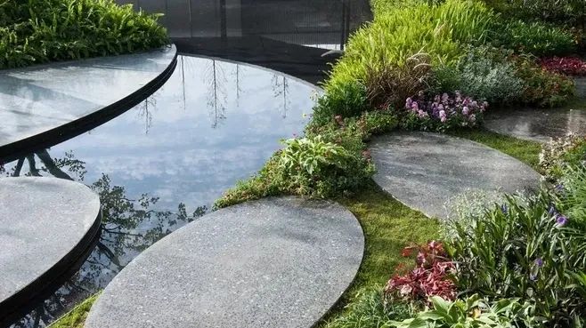 現(xiàn)代汀步的形式,已經(jīng)不止局限于傳統(tǒng)的自然形態(tài)了,各種形式和材質(zhì)都有了更多的選擇。有方形的、圓形亦或是橢圓形的;有石材、木材和金屬等。
