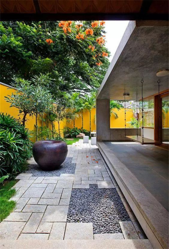 花園多選擇現(xiàn)代感很強(qiáng)的戶外家具,顏色選用白色或流行色?;▓@中主色彩一般不超過三種顏色,色彩以塊狀為主?;▓@布藝、小飾品和陶器的選擇顏色相對(duì)大膽,布藝紋樣簡(jiǎn)單抽象。