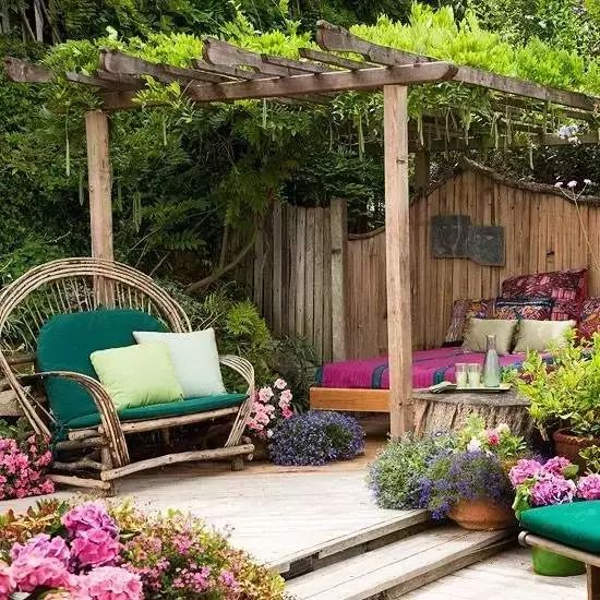 花園常見的棚架,有的裝飾累贅??梢郧械舴爆嵉幕^,簡(jiǎn)化圍來圍去的柵格,卸掉負(fù)擔(dān),就有美感;有的又過于簡(jiǎn)單,需要細(xì)節(jié)裝飾,如在柱與梁90度角間,加枚鐵藝花(如下圖),也會(huì)氣質(zhì)大變。
