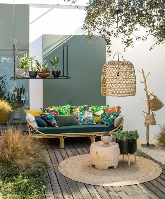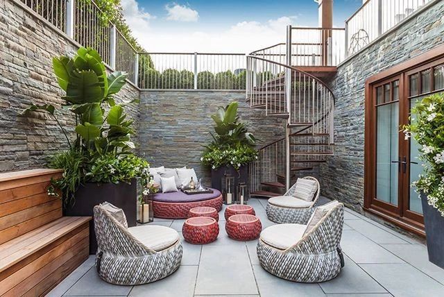 下沉式庭院,在梅雨季節(jié)很容易出現(xiàn)潮濕的感覺,所以地面鋪裝時盡量選擇天然的雨花石、戶外磚或防腐木,千萬不要使用軟木框架的家具,軟木會吸潮,容易導致框架受損,可選擇塑料、鋼鐵、石材框架作為代替。