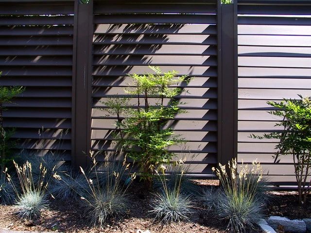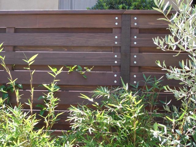 無論是橫板或豎板的木圍欄都可以采用“百葉窗”樣式做法(板條45°角傾斜)。如果想將通風與隱私結(jié)合起來,這種百葉式木圍欄是一個不錯的選擇。既能保護園主的隱私,又保障空氣流通,采光也很通透。
