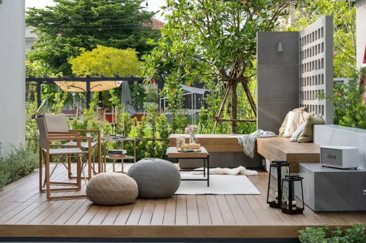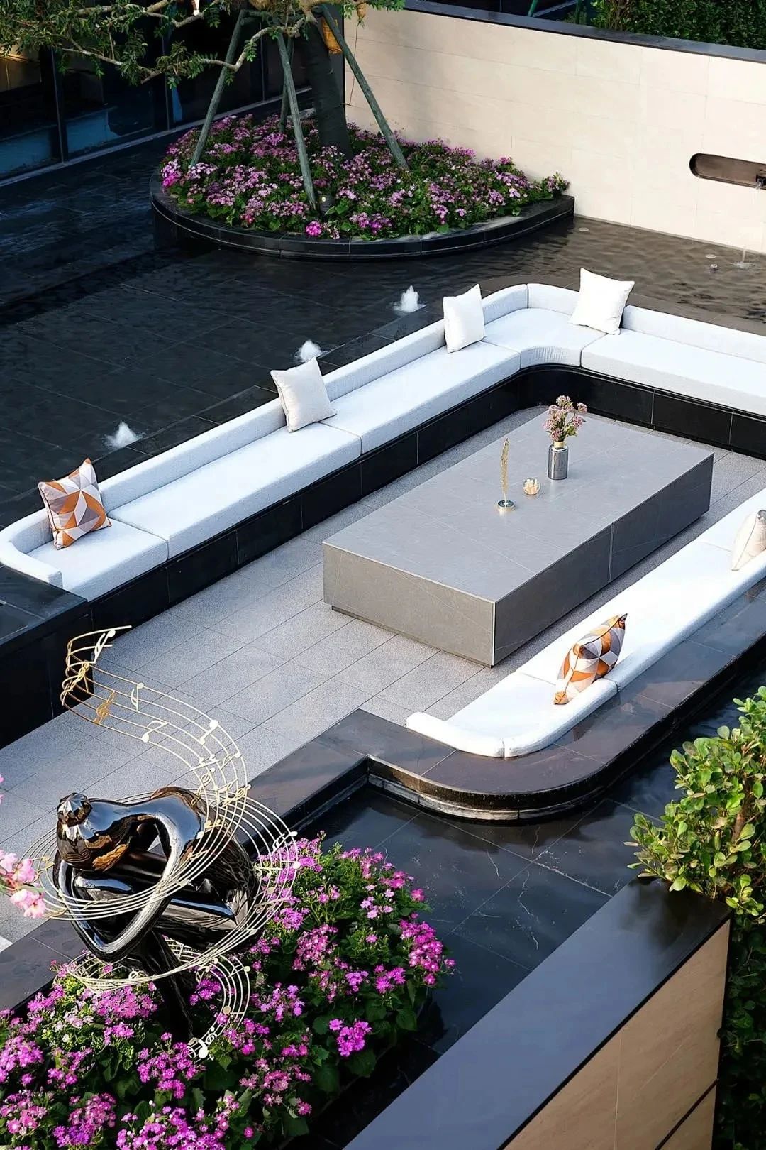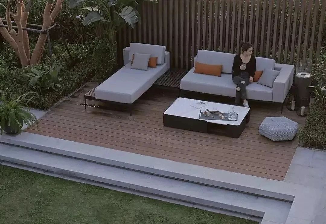 c.開(kāi)放式:視野開(kāi)闊,以休閑平臺(tái)為主,可以選擇與花園整體風(fēng)格相匹配的材質(zhì)和色彩,打造出既美觀又實(shí)用的休閑空間。