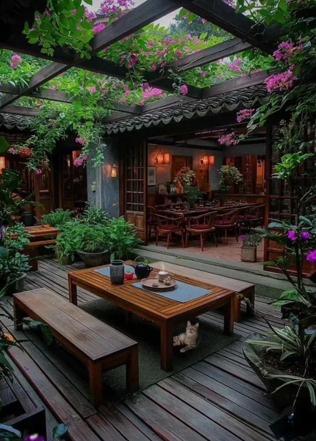 通過(guò)裝飾元素、色彩搭配和家具布局營(yíng)造溫馨的用餐氛圍,戶外餐廳的設(shè)計(jì)應(yīng)與庭院的整體風(fēng)格和周圍環(huán)境相融合,創(chuàng)造出和諧的戶外空間。