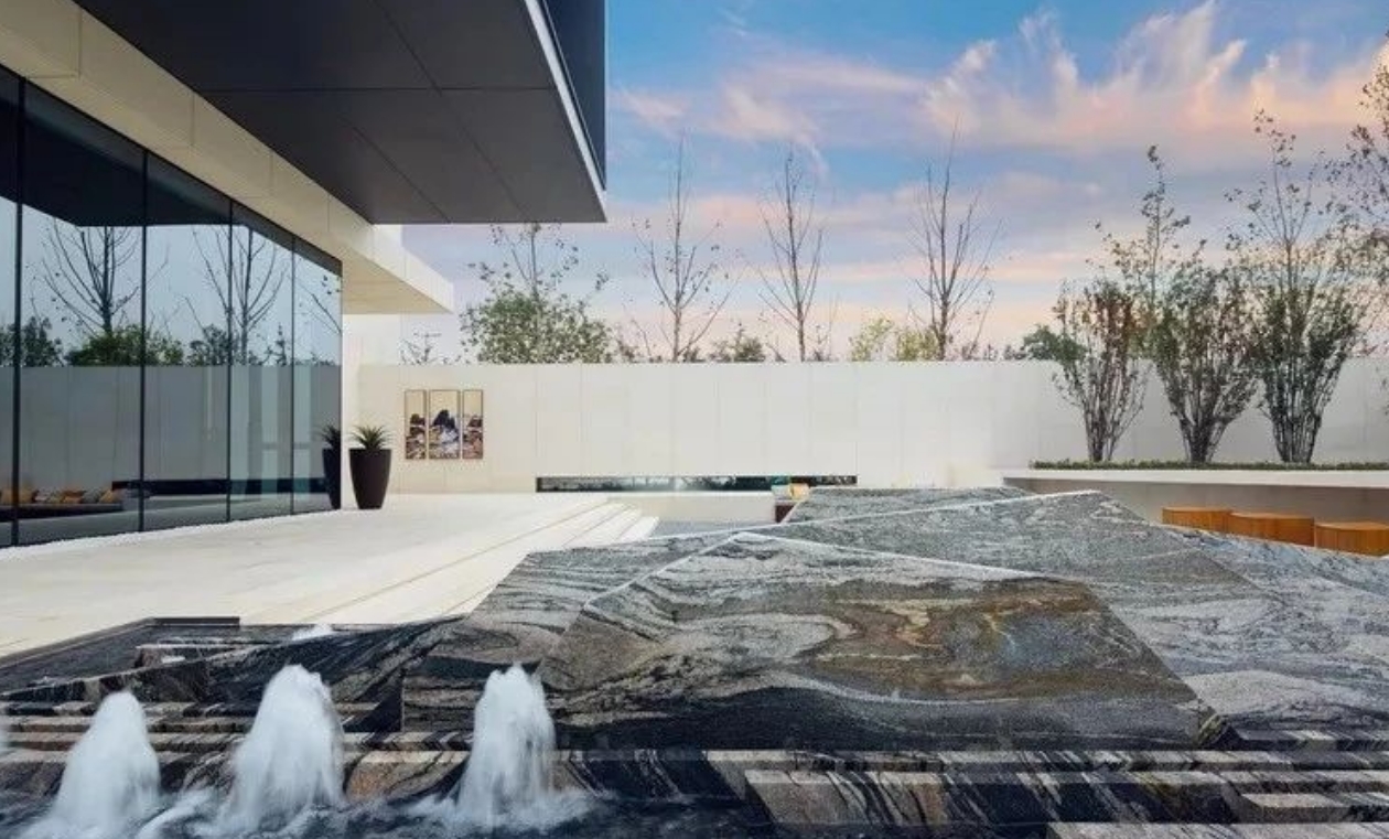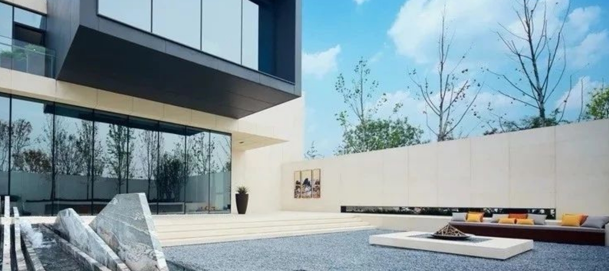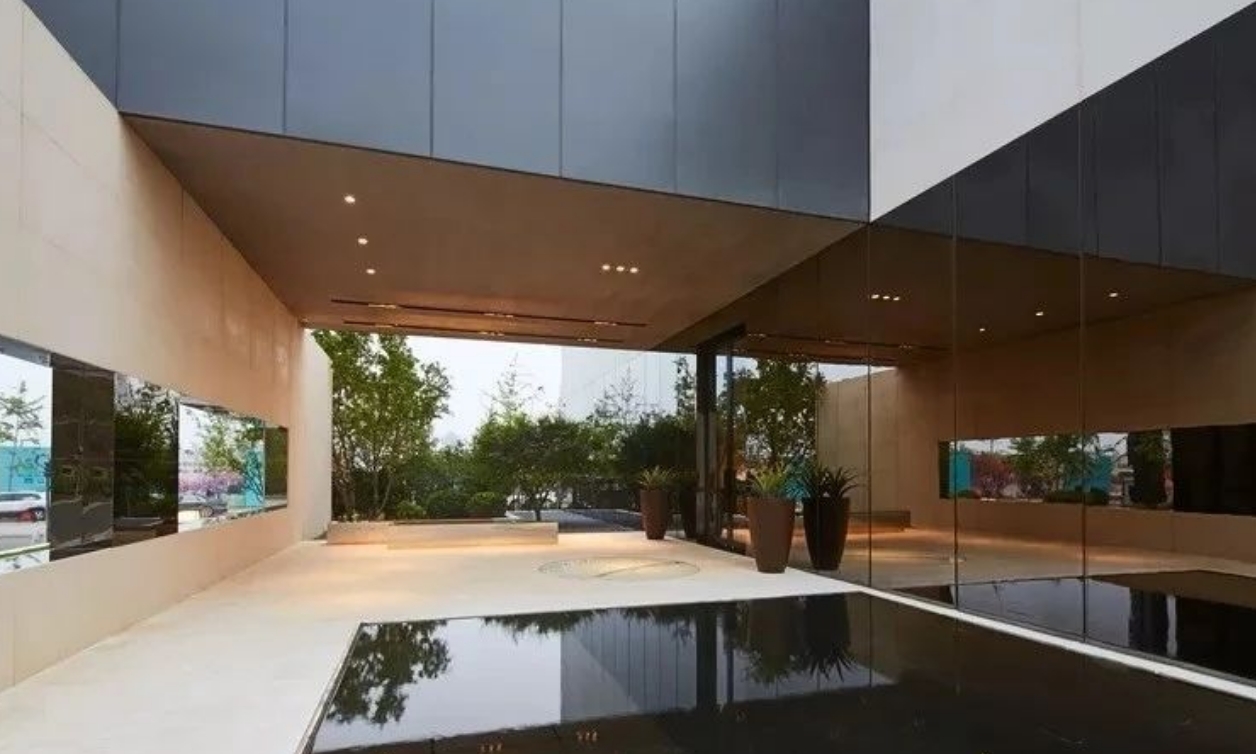 在前廳以鏡面水池和極簡樹池為組合營造出“一池一樹”為景的空間?!耙怀亍保ㄧR面水池),既是景也是底,在造景同時烘托建筑,營造氛圍?!耙粯洹笔蔷耙彩巧谠炀暗耐瑫r為空間增添一抹綠色,使人在進(jìn)入建筑之前靜心。下沉中庭處于整個場地的中間地帶,打破傳統(tǒng)下沉庭院的做法,將此地梳理成為前廳和后院的串聯(lián)空間。青島庭院設(shè)計(jì)