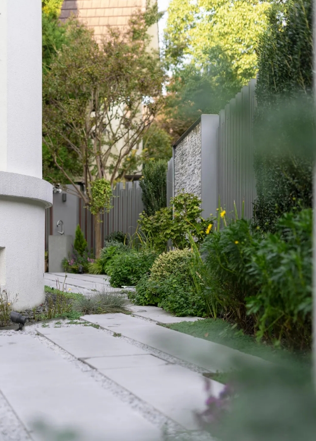 功能區(qū)之間的過渡可以通過簡潔的路徑、統(tǒng)一的材質(zhì)或植物來完成。避免使用過多的隔斷或過于復雜的過渡設計,讓人們在庭院中行走時感受到連貫與舒適。同時,利用植物的形態(tài)和色彩進行自然的分隔,營造出更加自然、和諧的環(huán)境。