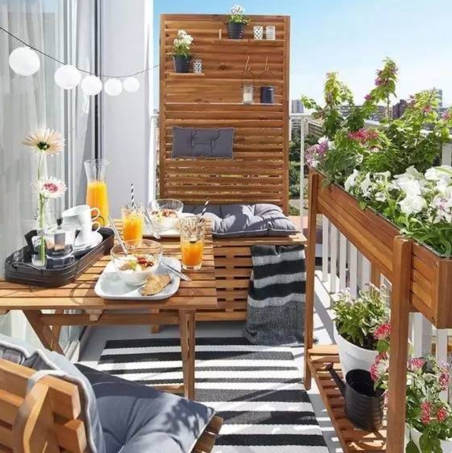 如果家中落地陽(yáng)臺(tái)夠大,不妨選購(gòu)一張與室內(nèi)家具色彩一致或截然相反戶外休閑桌,再配上兩個(gè)四方矮凳,并在其旁邊裝點(diǎn)上幾盆綠色植物,不僅能讓窄小的陽(yáng)臺(tái)變得寬敞一些,還能刻意營(yíng)造出一個(gè)四合小院的景致。