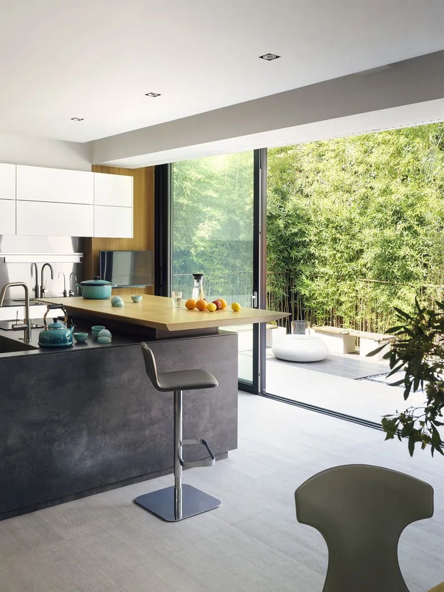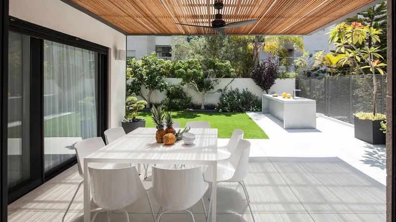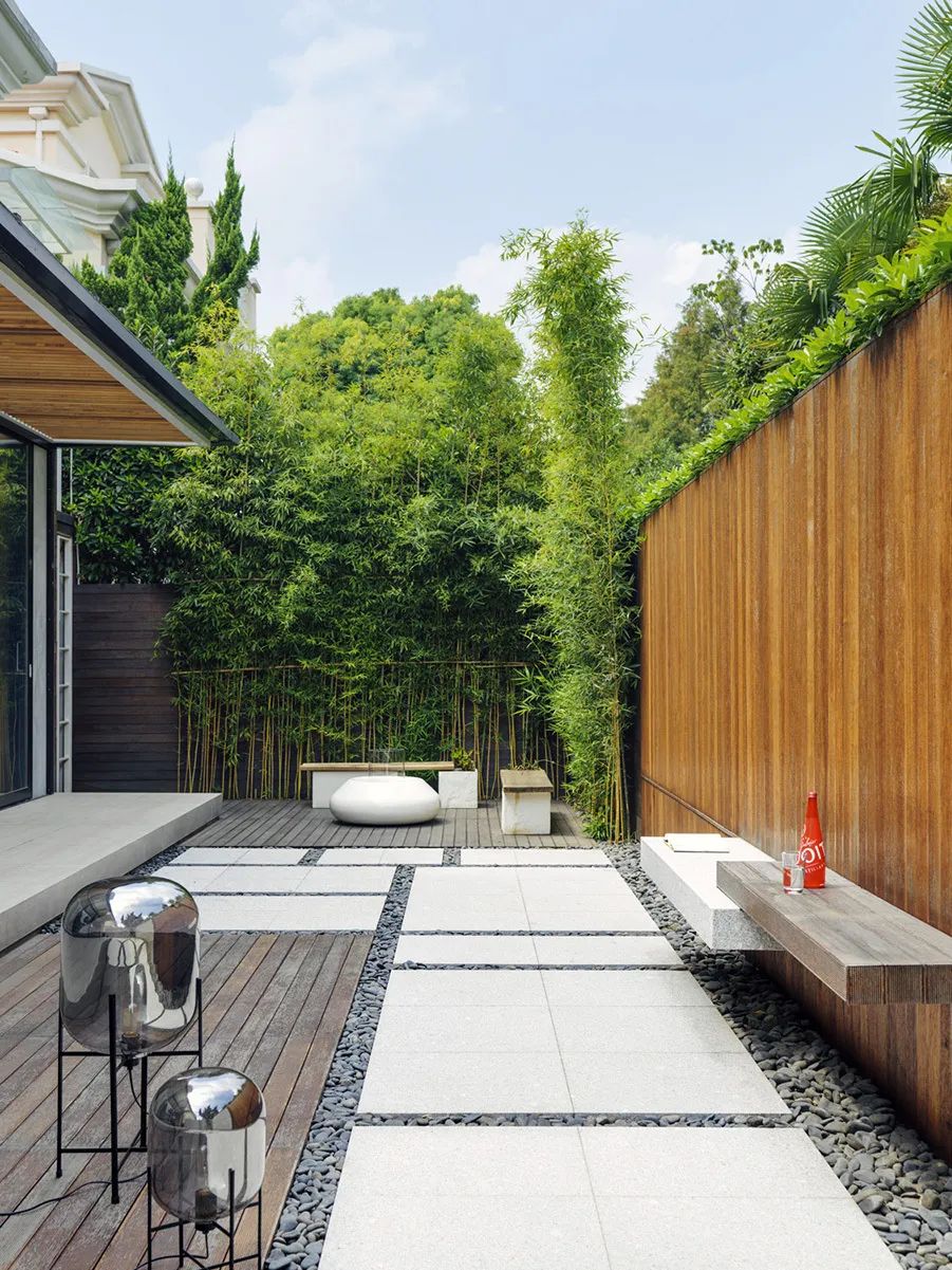 閑暇時(shí)和家人在庭院里聚聚餐、聊聊天,也無(wú)需顧及外界的影響,頗有世外桃源的意味。加上周圍濃郁的綠植,頂部空間設(shè)計(jì)陽(yáng)光頂,隱私感也會(huì)更強(qiáng)。