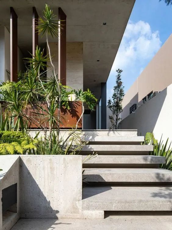 下沉式庭院利用坡差營(yíng)造出一種曲徑通幽的意境美,相較于平層的設(shè)計(jì),多了各種造型和植被的分割,讓空間在視覺上變得更有層次感,空間的布局也橫生了不少樂趣。