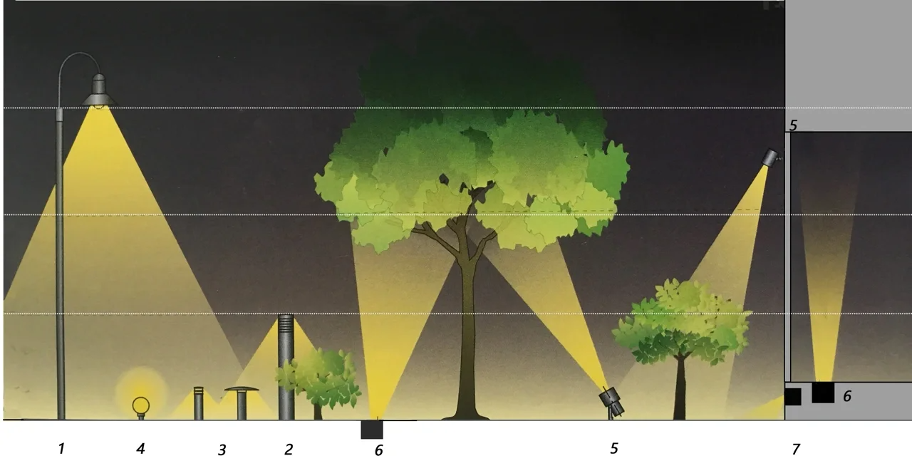 使用不同類型和高度的燈具來營造多個照明層次,包括整體照明、局部照明和裝飾照明。整體照明提供基本照明,局部照明用于特定區(qū)域或功能,裝飾照明用于突出庭院的特點和景觀。