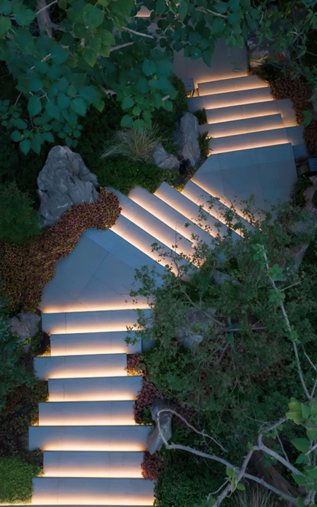 庭院道路與臺階的燈光設計主要是保證夜晚行走的安全性。一般使用燈帶或是低矮迷你射燈,也可安裝凹陷的鋪路燈,將光照射在路上或路的邊緣,不僅可以照明道路,還具有美觀的效果。