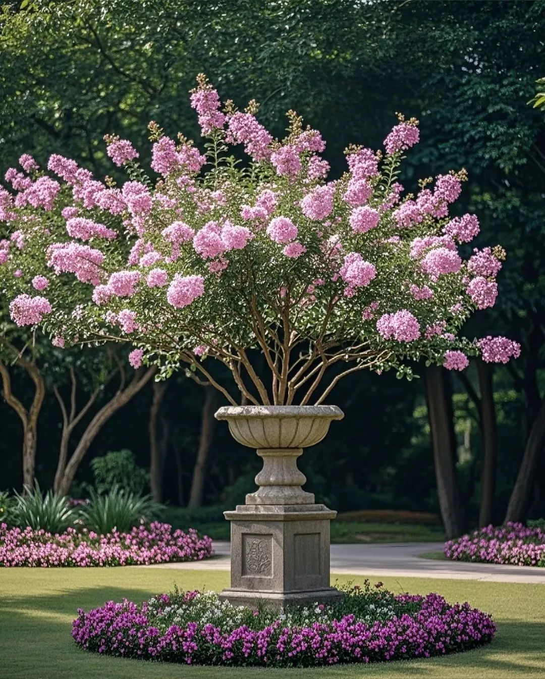 叢生紫薇與木槿交替配置,延長(zhǎng)夏季花期的觀賞時(shí)間。前者6-9月的綿長(zhǎng)花期與后者7-10月的次第開(kāi)放,形成持續(xù)四個(gè)月的花瀑效果。配置兩三種不同花期的灌木,確保每個(gè)視角都有綻放的焦點(diǎn)。