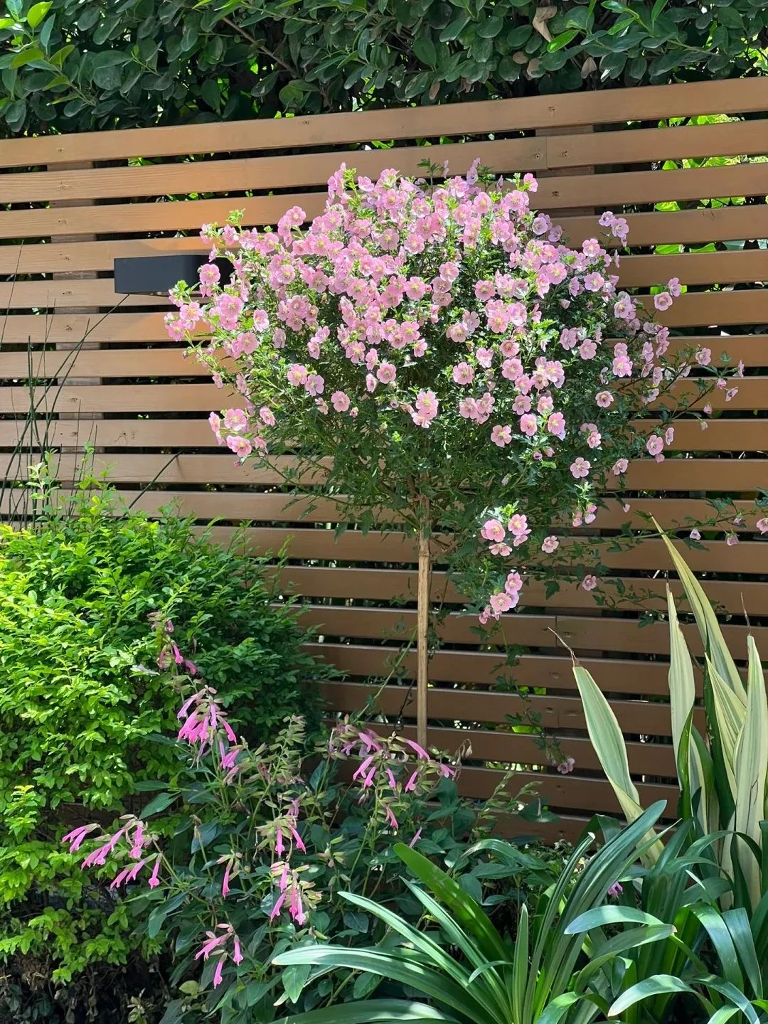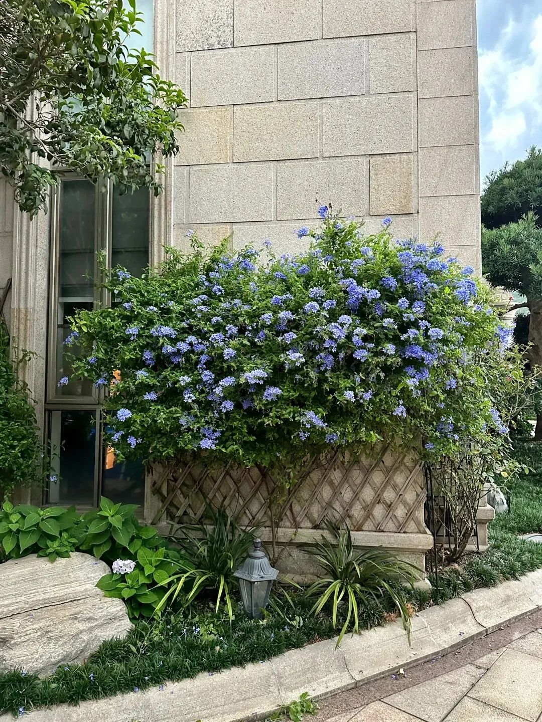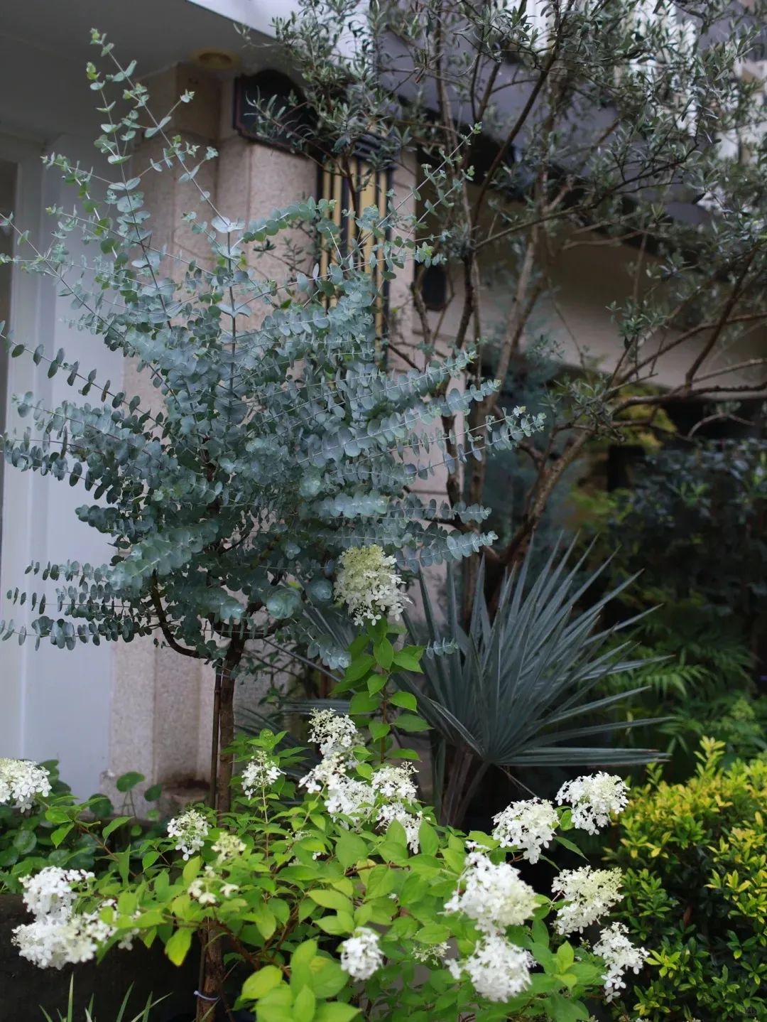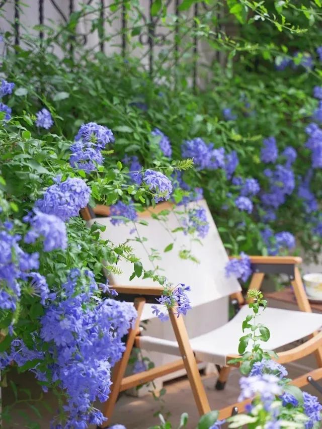 藍(lán)雪花與百子蓮的藍(lán)紫花序可產(chǎn)生視覺(jué)降溫2-3℃的錯(cuò)覺(jué),配合白色木繡球的純凈質(zhì)感,構(gòu)成經(jīng)典的"冰川三角"配色。在日照強(qiáng)烈的南向庭院,也可增加銀葉菊等灰調(diào)植物的比重,形成自然反光板。