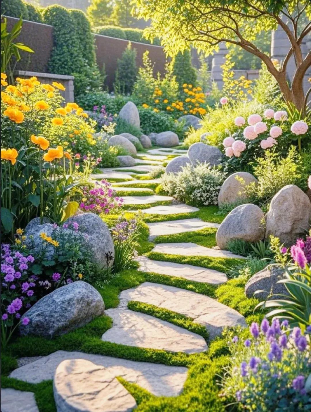 凌霄花的橙紅與金雞菊的明黃需少量搭配,控制在總種植面積的15%以內(nèi)。精妙之處在于將暖色植物布置在視覺(jué)終點(diǎn),比如廊架盡頭或景墻前方,利用色彩透視強(qiáng)化空間縱深感。