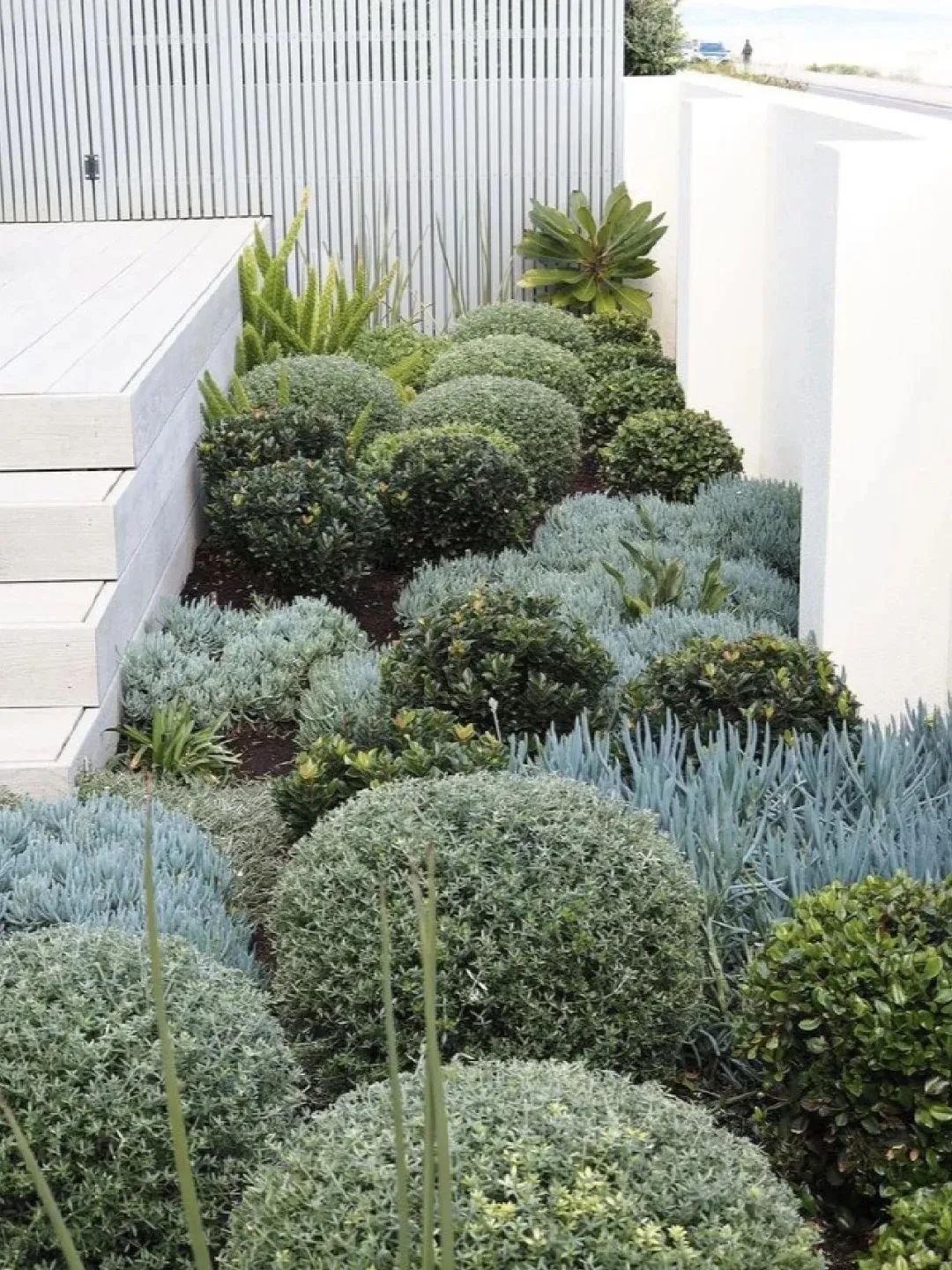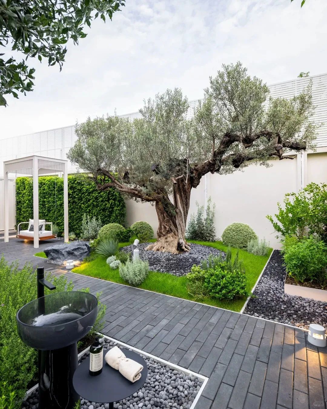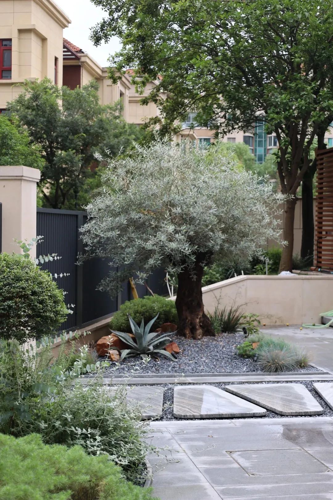 不再簡(jiǎn)單復(fù)制橄欖樹(shù)與迷迭香,而是提取其形態(tài)基因:用本地適生的檉柳模擬橄欖樹(shù)的蒼勁,以百里香地毯重現(xiàn)地中海灌叢的肌理。釉面陶盆種植的龍舌蘭,成為現(xiàn)代派的地中海符號(hào)。