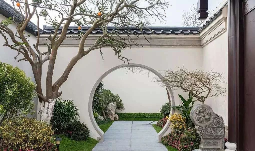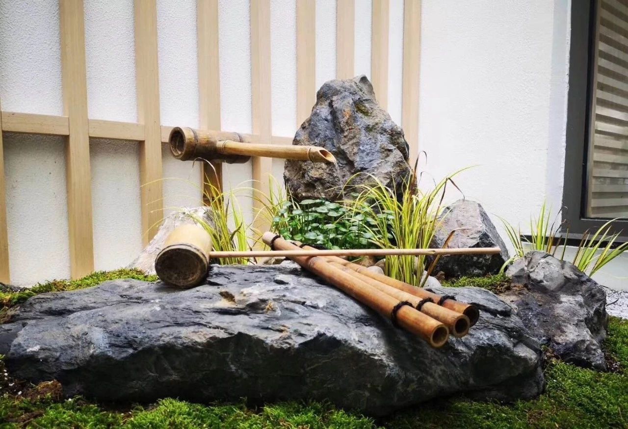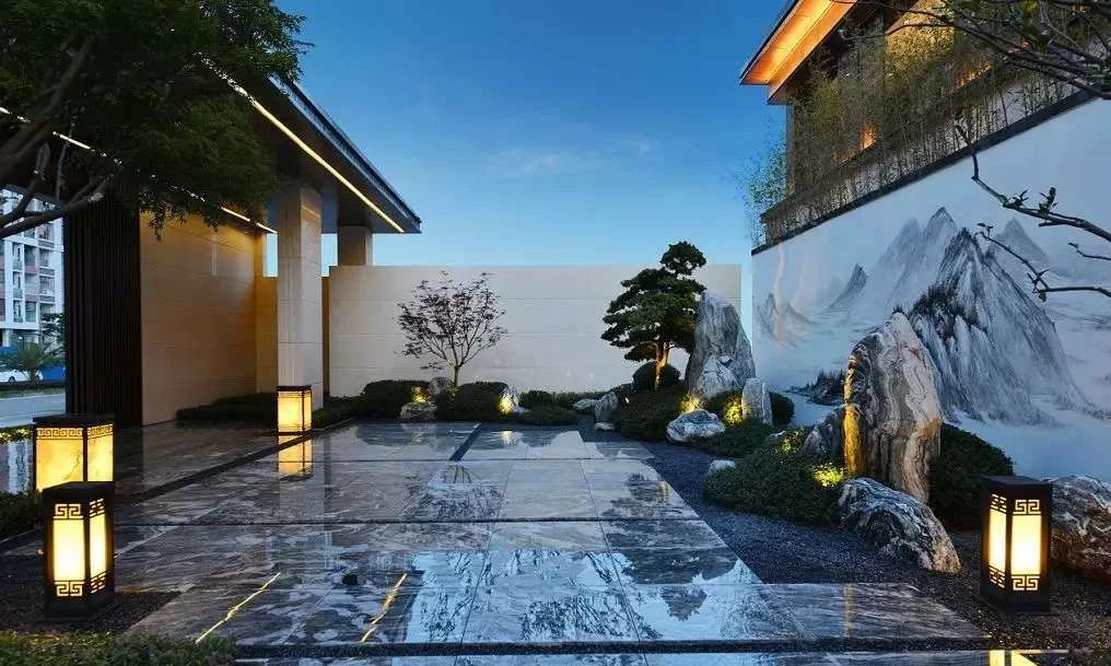 選取兩塊體態(tài)較大的石頭相對矗立,在意境上形成相互呼應(yīng)。而且石材的大小也不能完全一致,這樣既統(tǒng)一,又富有變化,營造自然的效果,否則就會顯得生硬刻意。除了兩塊主要的對景石,周邊還輔以少量石塊做點綴,在配以常青綠植和山水背景墻,景色之間呈現(xiàn)虛與實的變化,構(gòu)成一幅充滿中國風(fēng)情的水墨畫。