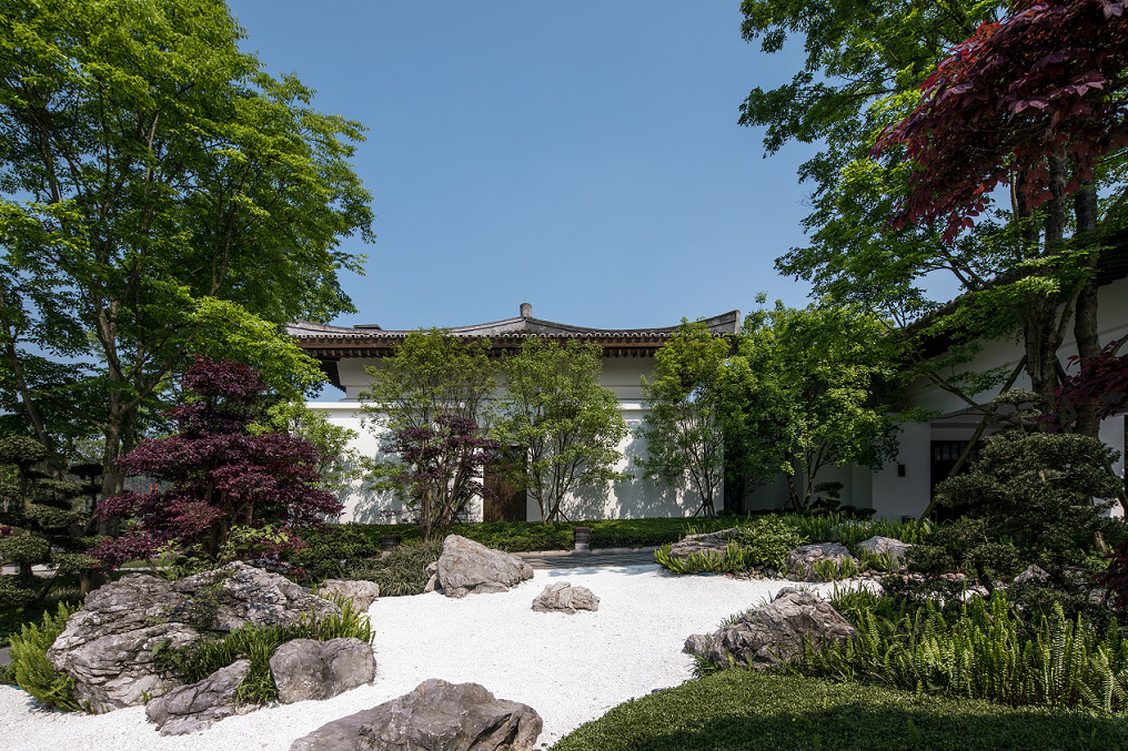 枯山水追求灑脫淡泊、脫離塵世的外在美,重視內(nèi)在的永恒感和歸屬感,它以白砂為水,石塊做山,避免了水體的變幻莫測,除去了花草樹木的交替枯榮。