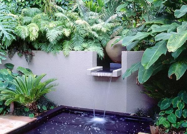 ③庭院中的噴泉是較好的焦點(diǎn)景,不只是因?yàn)樗暗囊曈X清透效果,而且還因?yàn)樗鞯膰W啦聲能夠掩蓋城市的喧囂。而且設(shè)計(jì)師還建議,將低矮的噴泉和灌溉的自由管道相連接,可以保證花園里隨時有水流。