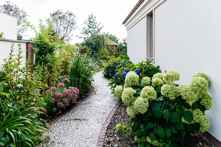 如果你特別喜歡種植花草的話,可以在進行私家別墅花園設(shè)計時采用這樣的方式。別墅花園的側(cè)面只一條簡單的小徑,將其一分為二,邊上種植上翠綠蘢蔥的各色植物,尤其是這繡球可愛極了。