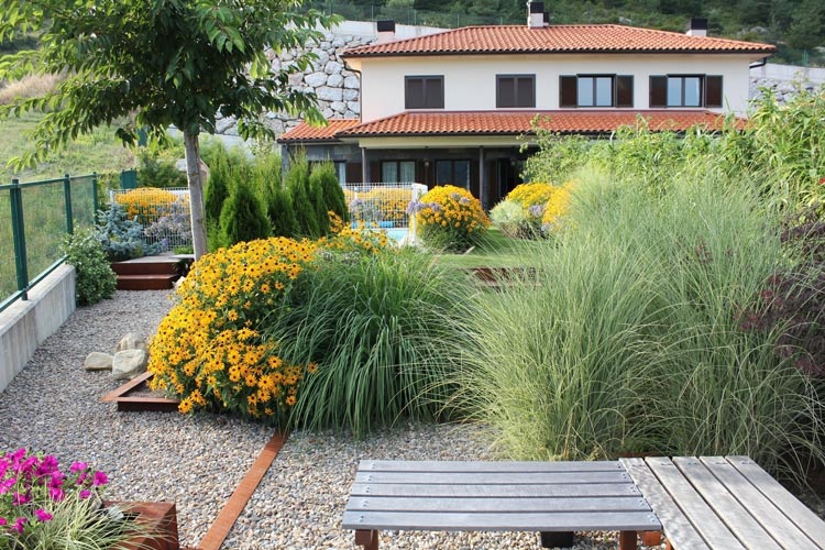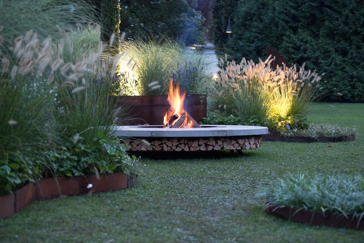一眼望去別墅花園中都是茂盛的狗尾巴草,花園中再設(shè)置一個火爐,火爐的臺面在聚餐時還可以作為餐桌使用。除此之外整個花園都是一片大大的草坪,這樣的私家別墅花園設(shè)計方式不僅能滿足市場生活所需,而且后期維護成本也較低。
